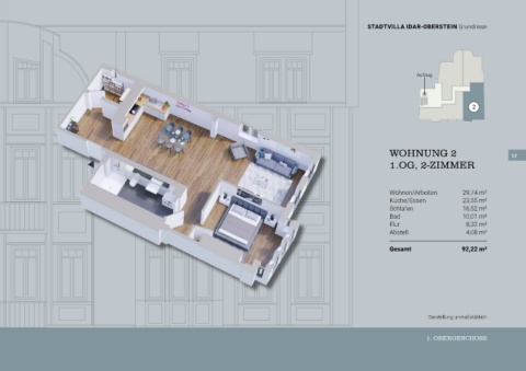 STADTVILLA IDAR-OBERSTEIN Grundrisse Aufzug 2 WOHNUNG 2 17 1.OG, 2-ZIMMER Wohnen/Arbeiten 29,74 m² Küche/Essen 23,55 m² Schlafen 16,52 m² Bad 10,01 m² Flur 8,32 m² Abstell. 4,08 m² Gesamt 92,22 m² Darstellung unmaßstäblich 1. OBERGESCHOSS