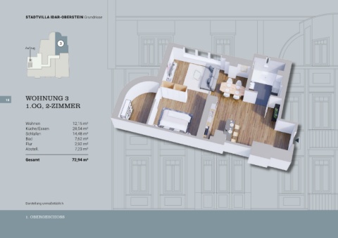 STADTVILLA IDAR-OBERSTEIN Grundrisse 3 Aufzug WOHNUNG 3 18 1.OG, 2-ZIMMER Wohnen 12,15 m² Küche/Essen 28,54 m² Schlafen 14,48 m² Bad 7,62 m² Flur 2,92 m² Abstell. 7,23 m² Gesamt 72,94 m² Darstellung unmaßstäblich 1. OBERGESCHOSS