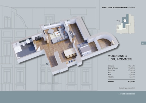 STADTVILLA IDAR-OBERSTEIN Grundrisse Aufzug 4 19 WOHNUNG 4 1.OG, 2-ZIMMER Wohnen 18,16 m² Küche/Essen 17,53 m² Schlafen 27,02 m² Bad 12,53 m² Flur 14,85 m² Abstell. 7,55 m² Gesamt 97,64 m² Darstellung unmaßstäblich 1. OBERGESCHOSS