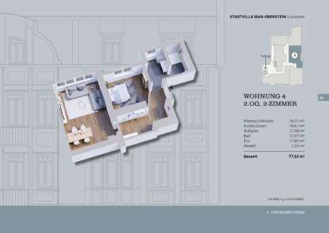 STADTVILLA IDAR-OBERSTEIN Grundrisse Aufzug 4 WOHNUNG 4 23 2.OG, 2-ZIMMER Wohnen/Arbeiten 16,07 m² Küche/Essen 16,67 m² Schlafen 17,58 m² Bad 12,97 m² Flur 11,83 m² Abstell. 2,50 m² Gesamt 77,62 m² Darstellung unmaßstäblich 2. OBERGESCHOSS