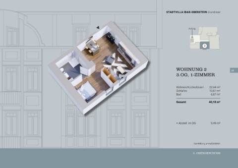 STADTVILLA IDAR-OBERSTEIN Grundrisse Aufzug 2 WOHNUNG 2 27 3.OG, 1-ZIMMER Wohnen/Küche/Essen 22,44 m² Schlafen 10,87 m² Bad 6,87 m² Gesamt 40,18 m² + Abstell. im DG 9,49 m² Darstellung unmaßstäblich 3. OBERGESCHOSS