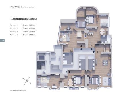 STADTVILLA Geschossgrundrisse 1.OBERGESCHOSS Wohnung 1: 2 Zimmer, 78,61 m² Wohnung 2: 2 Zimmer, 92,22 m² Wohnung 3: 2 Zimmer, 72,94 m² Wohnung 4: 2 Zimmer, 97,64 m² 34 4 3 2 1 Darstellung unmaßstäblich