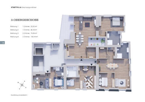 STADTVILLA Geschossgrundrisse 3.OBERGESCHOSS Wohnung 1: 1 Zimmer, 33,30 m² Wohnung 2: 1 Zimmer, 40,18 m² Wohnung 3: 2 Zimmer, 79,38 m² Wohnung 4: 2 Zimmer, 100,14 m² 36 4 3 2 1 Darstellung unmaßstäblich