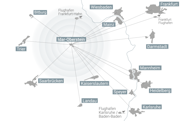 Und wen es noch weiter in die Ferne zieht: Mit dem Auto oder Taxi gelangt man in nur 38 Minuten* zum internationalen Flughafen Frankfurt-Hahn, der viele Ziele in ganz Europa ansteuert. Idyllisches, ruhiges Leben in der Kleinstadt und gute Anbindung an quirlige Metropolen: Idar-Oberstein bietet beides.