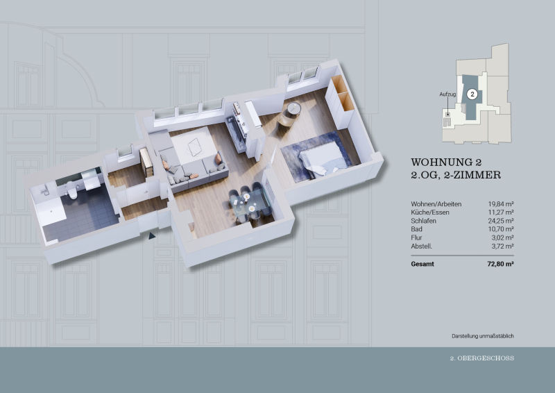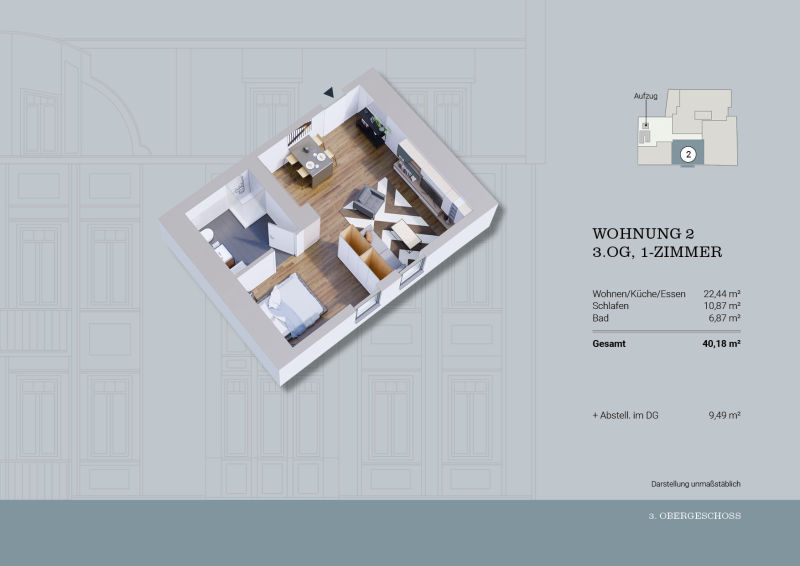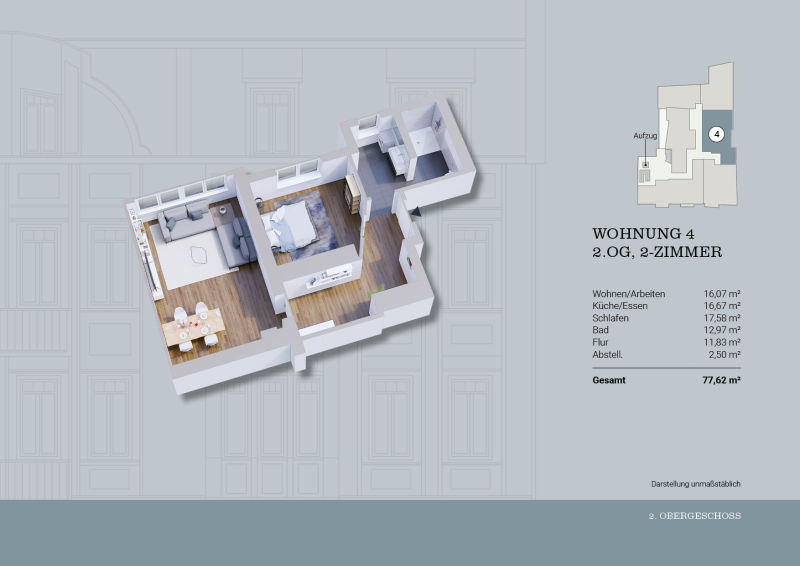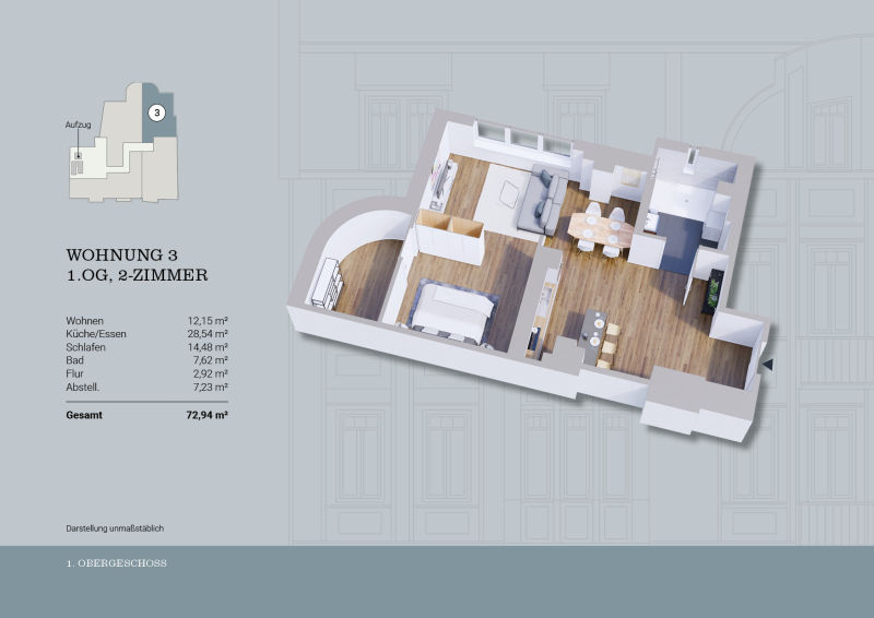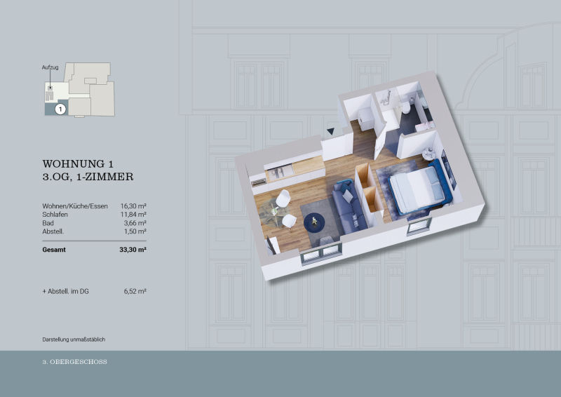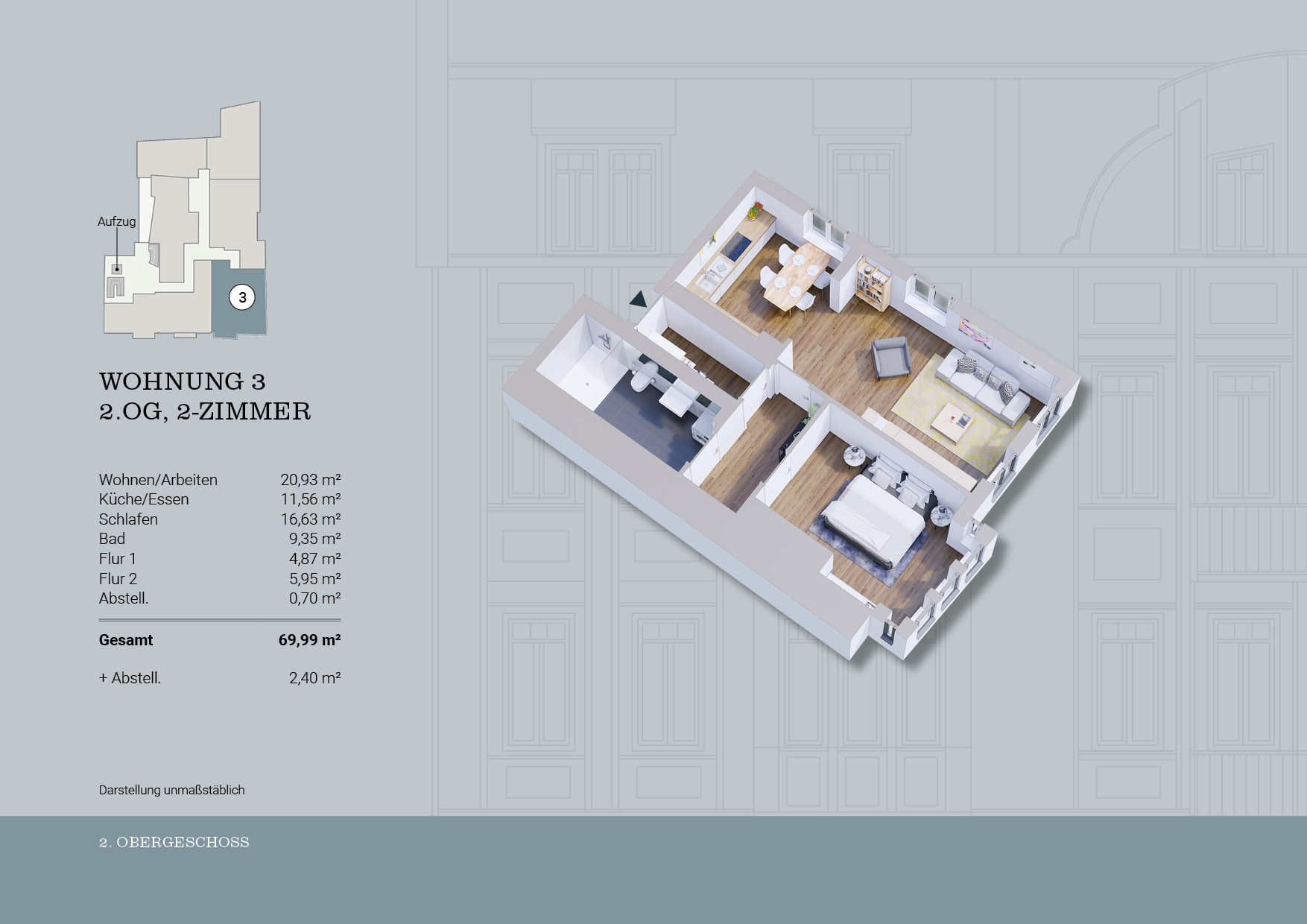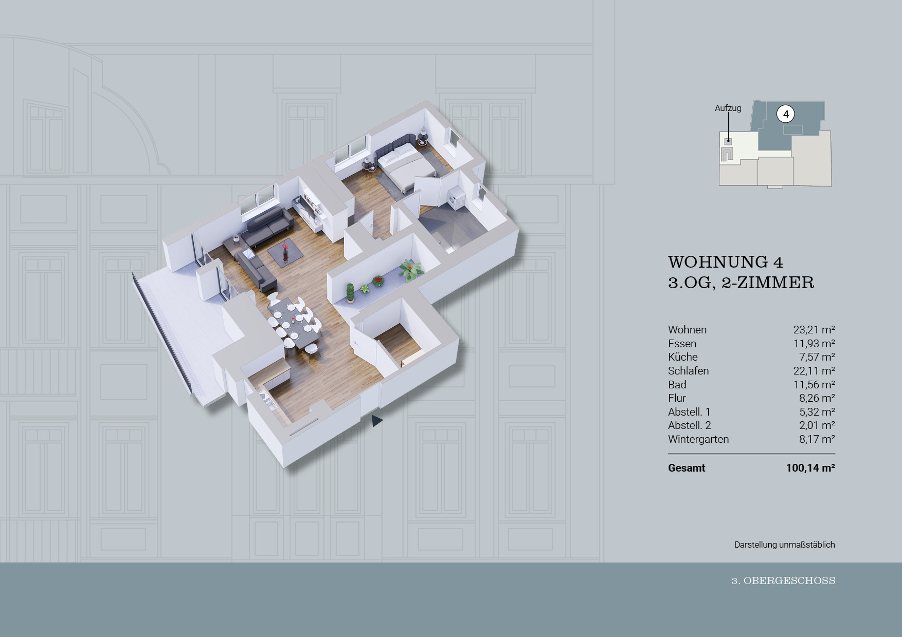 Ein Aufzug sorgt für komfortablen sowie barrierefreien Zugang und ermöglicht so das Wohnen in vielen Lebenssituationen. Besonders hilfreich ist er, wenn man mit Kinderwagen oder schweren Getränkekisten nach Hause kommt, aber auch im höheren Alter, wenn das Treppensteigen allmählich schwerer fällt.
