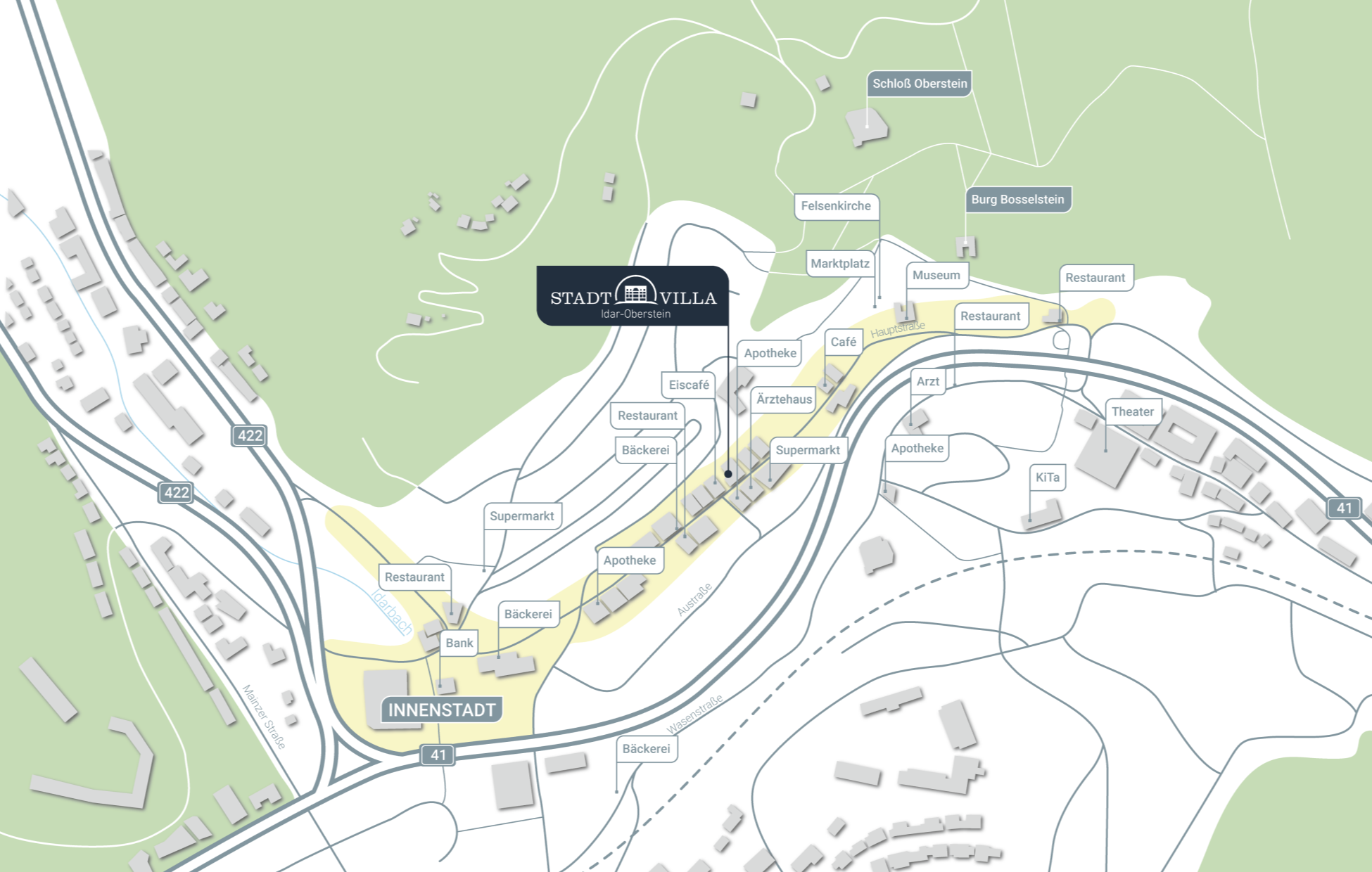 Trotz der zentralen Lage bieten viele Räume der STADTVILLA eine Aussicht ins Grüne: Der Blick fällt auf den bewaldeten Berg, an dem das Touristen-Highlight Felsenkirche steht und der von Schloss Oberstein bekrönt wird.